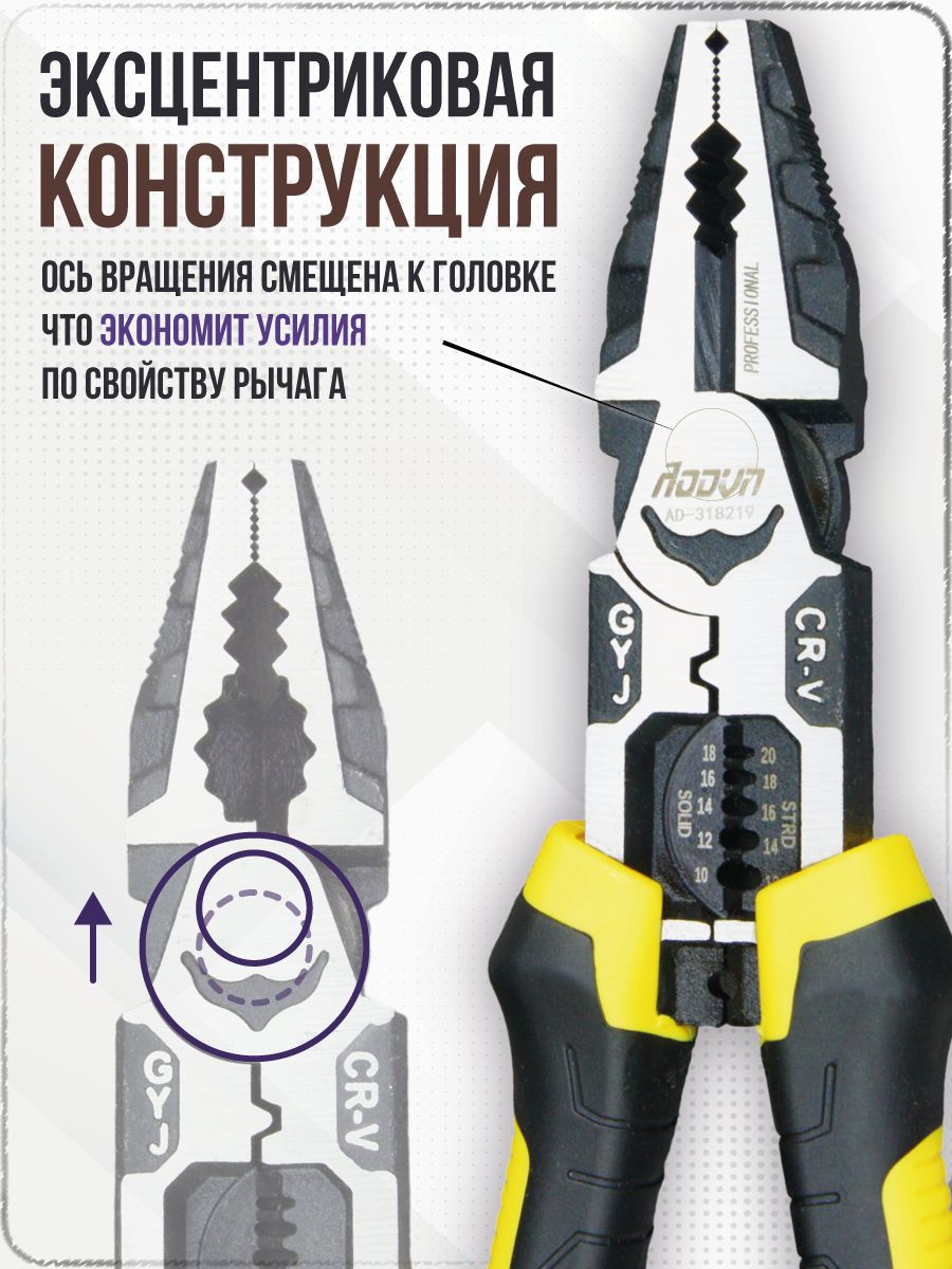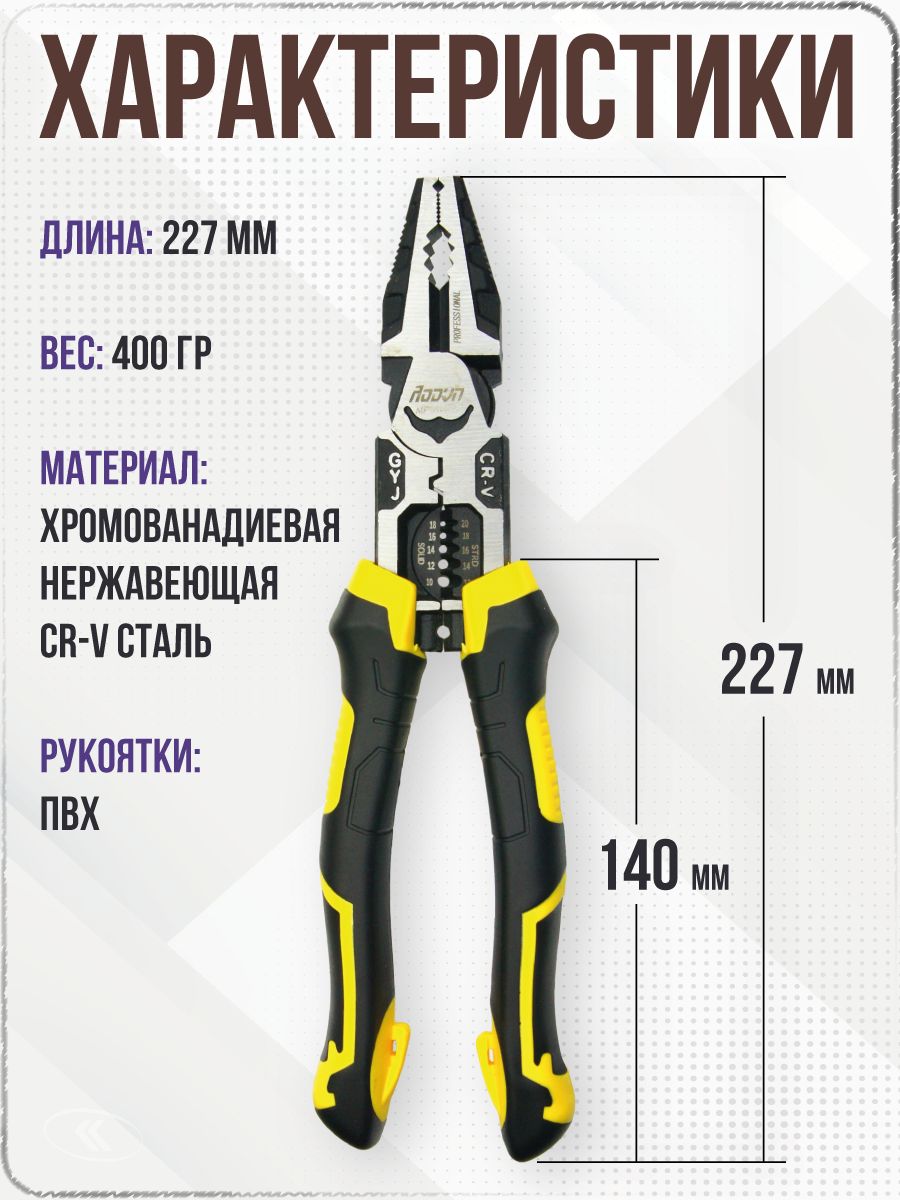 Но самое главное — это многофункциональность! Эти универсальные пассатижи умеют многое: зачистка проводов и снятие изоляции (стриппер), обжим клемм и кабельных наконечников (кримпер), откусывание стальной проволоки (бокорезы), могут использоваться как резак для различных типов проводов, держатель гвоздей, саморезов или удобные кусачки.